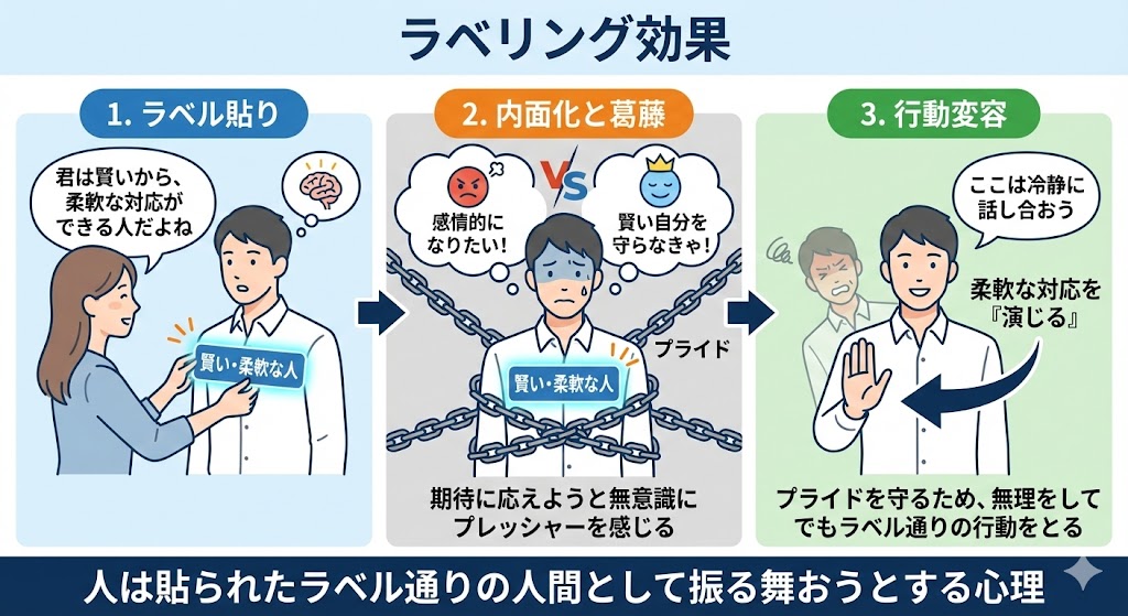 彼に「君は賢いから、柔軟な対応ができる側の人だよね」というラベルを貼ることで、彼はその「賢い自分」というイメージを守ろうとします。