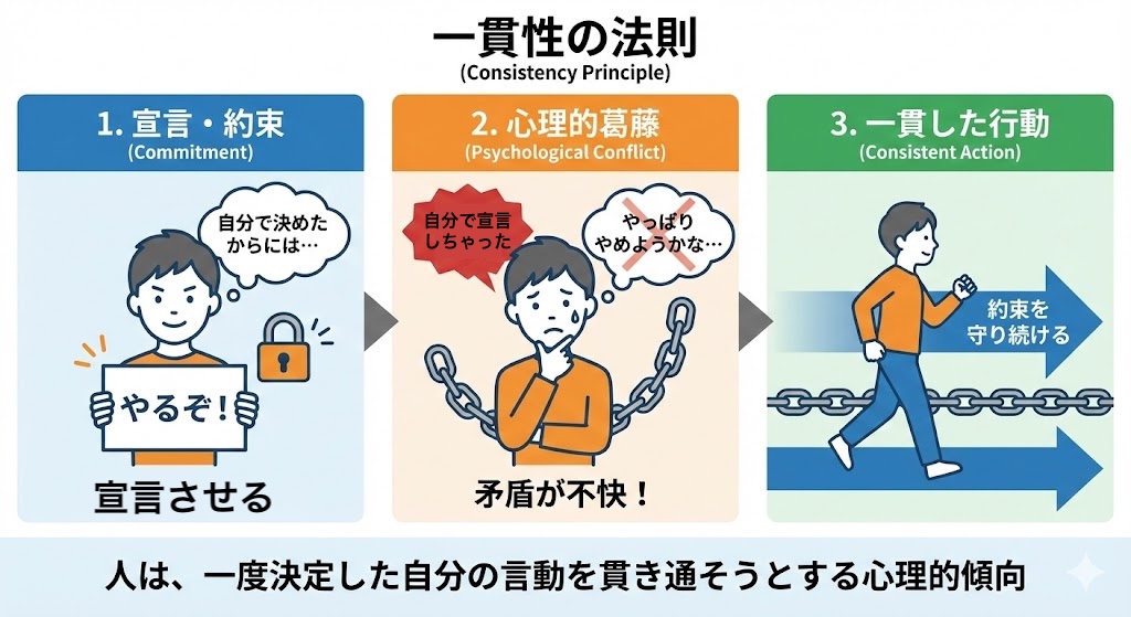 つまりこの手法は「自分で認めたルール」と「他者からの評価」という2つの鎖で、彼の価値観を縛り上げる戦術なのです。