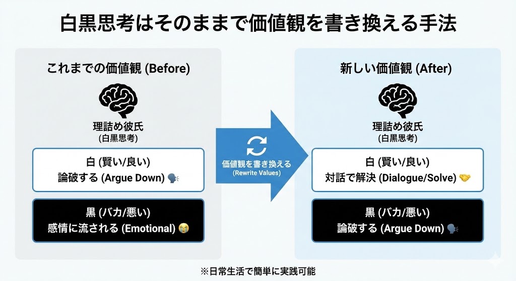いよいよここから理詰め彼氏の考え方を根本的に変化させる方法を解説していきます。その方法とは彼の「白黒思考」という特性はそのままに、価値観そのものを書き換えてしまう手法です。