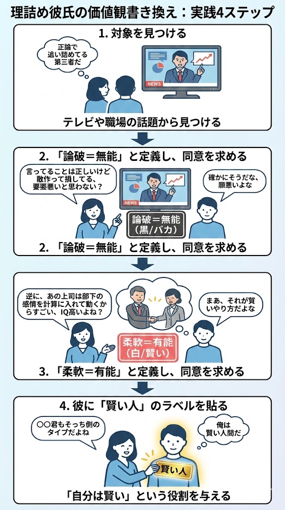 「逆に、あの上司は部下の感情を計算に入れて動くからすごいよね。やっぱIQ高い人は違うよね?」 → 「まあ、それが賢いやり方だよな」と同意させます。 - 彼に「賢い人」のラベルを貼る
