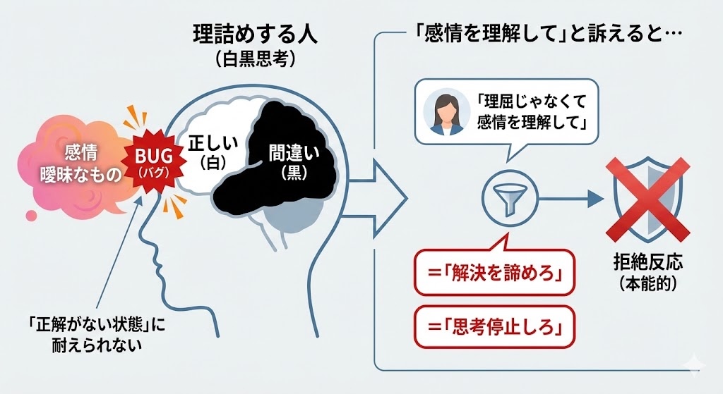 理詰めする人間の多くは、「正解がない状態」に耐えられません。 彼らにとって世界は「正しい(白)」か「間違い(黒)」のどちらかであり、答えの出ない「感情」のような曖昧なものは、脳内で処理できないバグとみなされます。