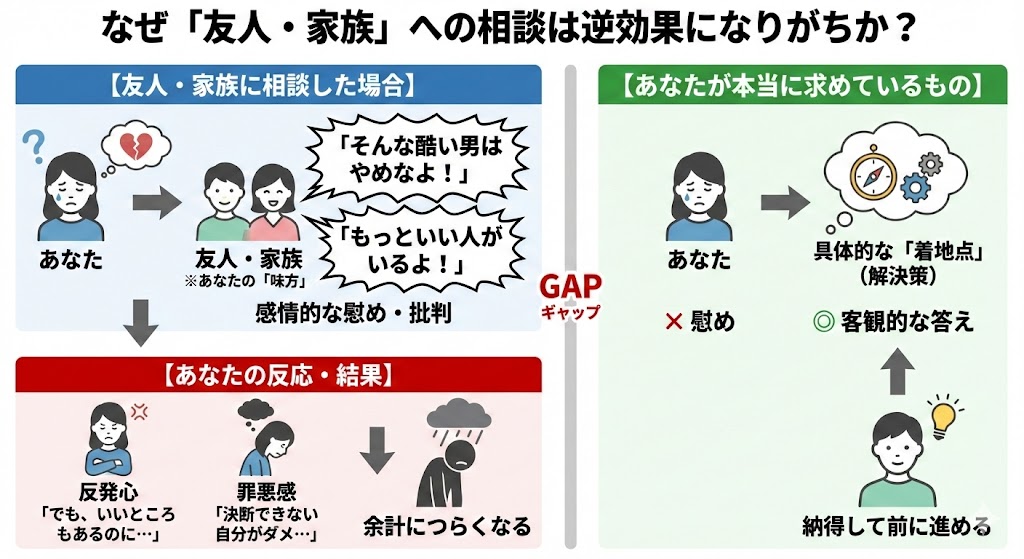 そんな中で「別れた方がいい」と頭ごなしに言われると、逆に「彼のいいところもあるのに…」と反発心が生まれたり、決断できない自分に罪悪感を抱いたりして、余計につらくなってしまいます。
