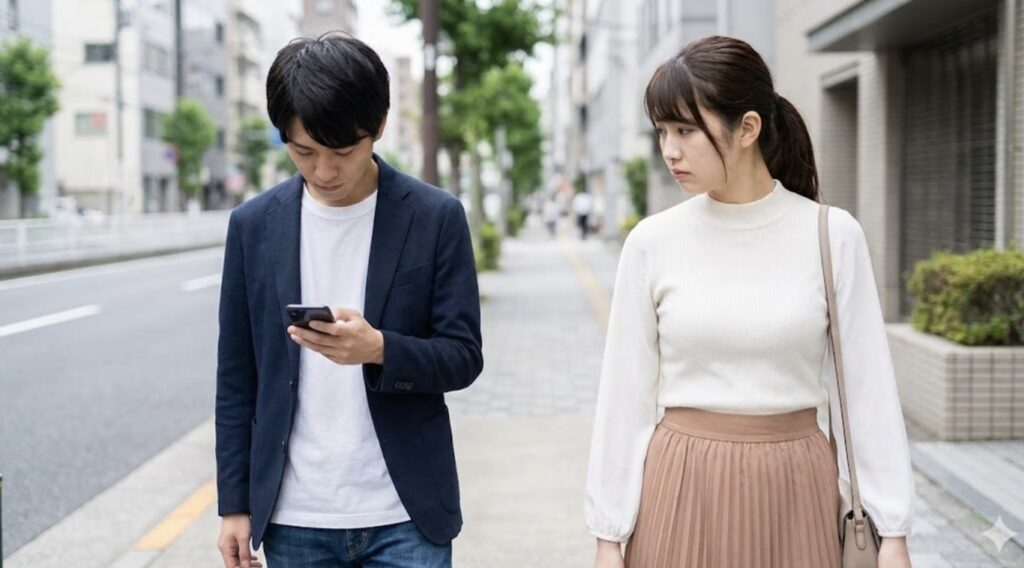 緊急の仕事ならまだしも、SNSやゲームをしながら歩いているなら、彼はあなたに対して「気を使う必要がない相手」と判断しています。もし彼がそのような態度を取り続けるなら、関係を見直すタイミングかもしれません。
